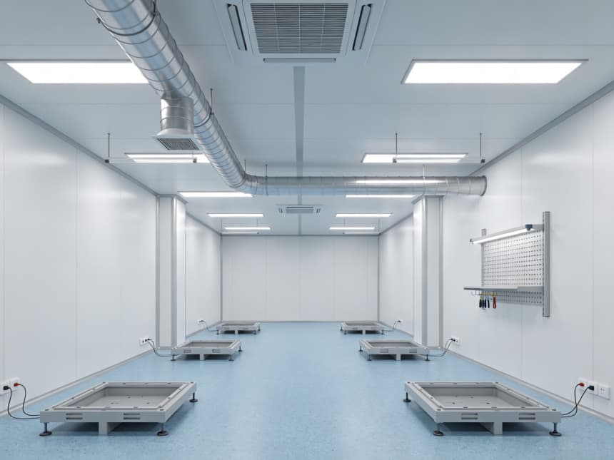 電子光學車間內部細節設計精準匹配行業核心需求,整體采用淺藍色防靜電潔凈地坪與白色無縫潔凈墻面的組合,風格簡約統一。地面選用3mm厚環氧防靜電材質,表面經啞光工藝處理,既能有效規避強光反射對光學檢測造成的干擾,又具備10?-10?Ω的穩定防靜電性能;同時兼具優異的耐磨特性,可耐受酒精等常用清潔劑擦拭,墻角均采用50mm圓弧設計,從根源上消除積塵死角,筑牢潔凈基礎。