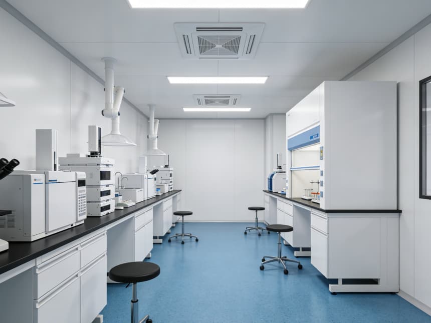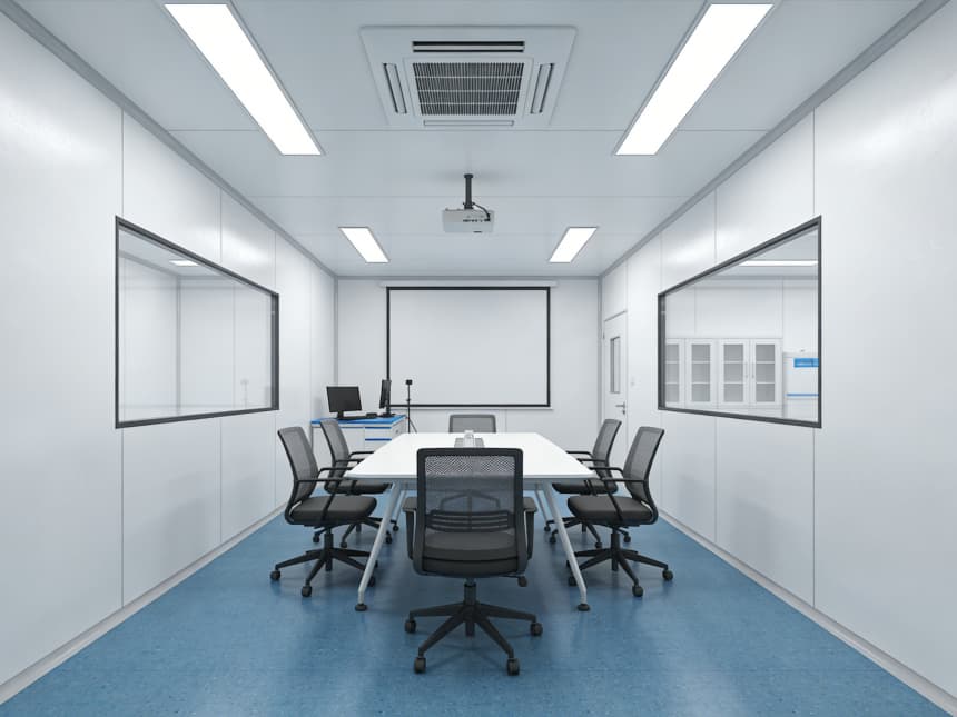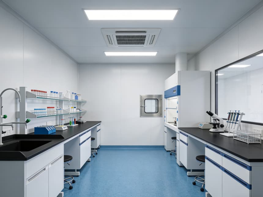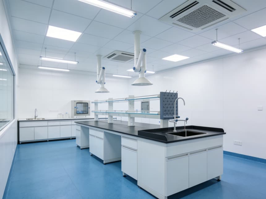 內(nèi)部研發(fā)空間均以藍色耐磨防靜電地坪搭配白色無縫抗菌墻面,視覺清爽且適配研發(fā)需求。藍色地面選用高耐磨環(huán)氧材質(zhì),具備良好的承重性與易清潔性,可耐受實驗試劑殘留擦拭,同時兼具輕微防靜電性能,保護精密研發(fā)設(shè)備;白色墻面采用環(huán)保抗菌涂層,平整度高且減少光線反射,搭配嵌入式護眼照明,營造舒適的研發(fā)視覺環(huán)境。