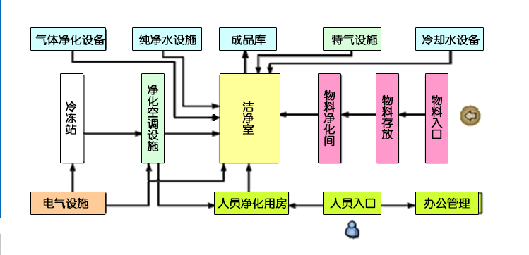 LED/液晶/線路板潔凈無塵室除了要完成上述的功能、目的外,因為制造過程中工藝生產(chǎn)設(shè)備都是在潔凈無塵室內(nèi)操作的,以供生產(chǎn)工藝機臺使用,潔凈無塵室與各系統(tǒng)關(guān)系如下: