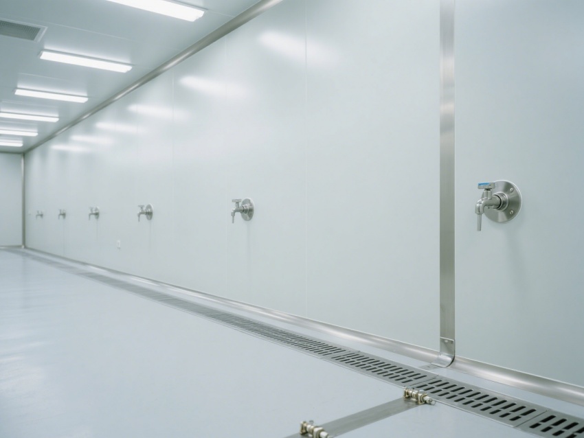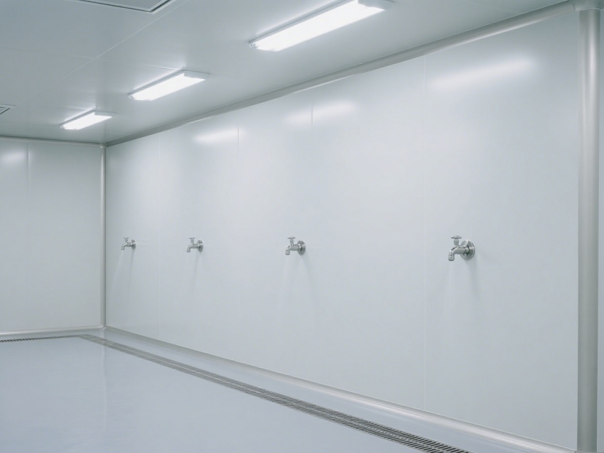 本次呈現(xiàn)的無塵無菌車間效果圖,整體采用極簡工業(yè)風(fēng)設(shè)計(jì),墻面、地面、頂面均選用一體化抑菌潔凈板材,色調(diào)以醫(yī)用級純白為主,搭配淺灰金屬收邊,視覺上凸顯整潔通透感。?