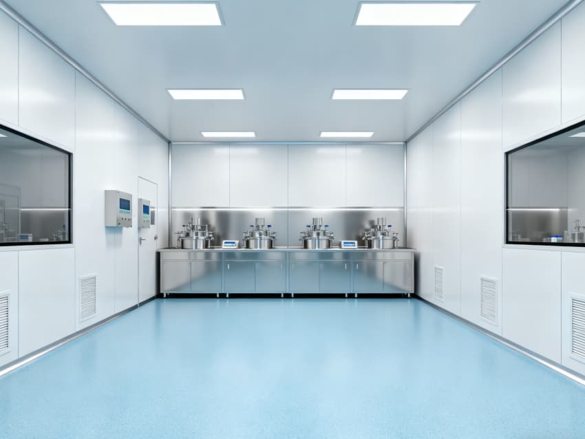 在環(huán)境控制層面,本設計彰顯卓越優(yōu)勢:地面選用淺藍色防滑防腐蝕環(huán)氧材料,不僅具備優(yōu)異的抗藥劑侵蝕性能,而且清潔消毒極為便捷;四周白色抗菌墻面采用圓弧轉(zhuǎn)角工藝,有效規(guī)避粉塵積聚風險,搭配全吊頂潔凈送風系統(tǒng),可將潔凈度穩(wěn)定維持在萬級標準,精準契合藥劑生產(chǎn)對微環(huán)境的嚴苛需求。?